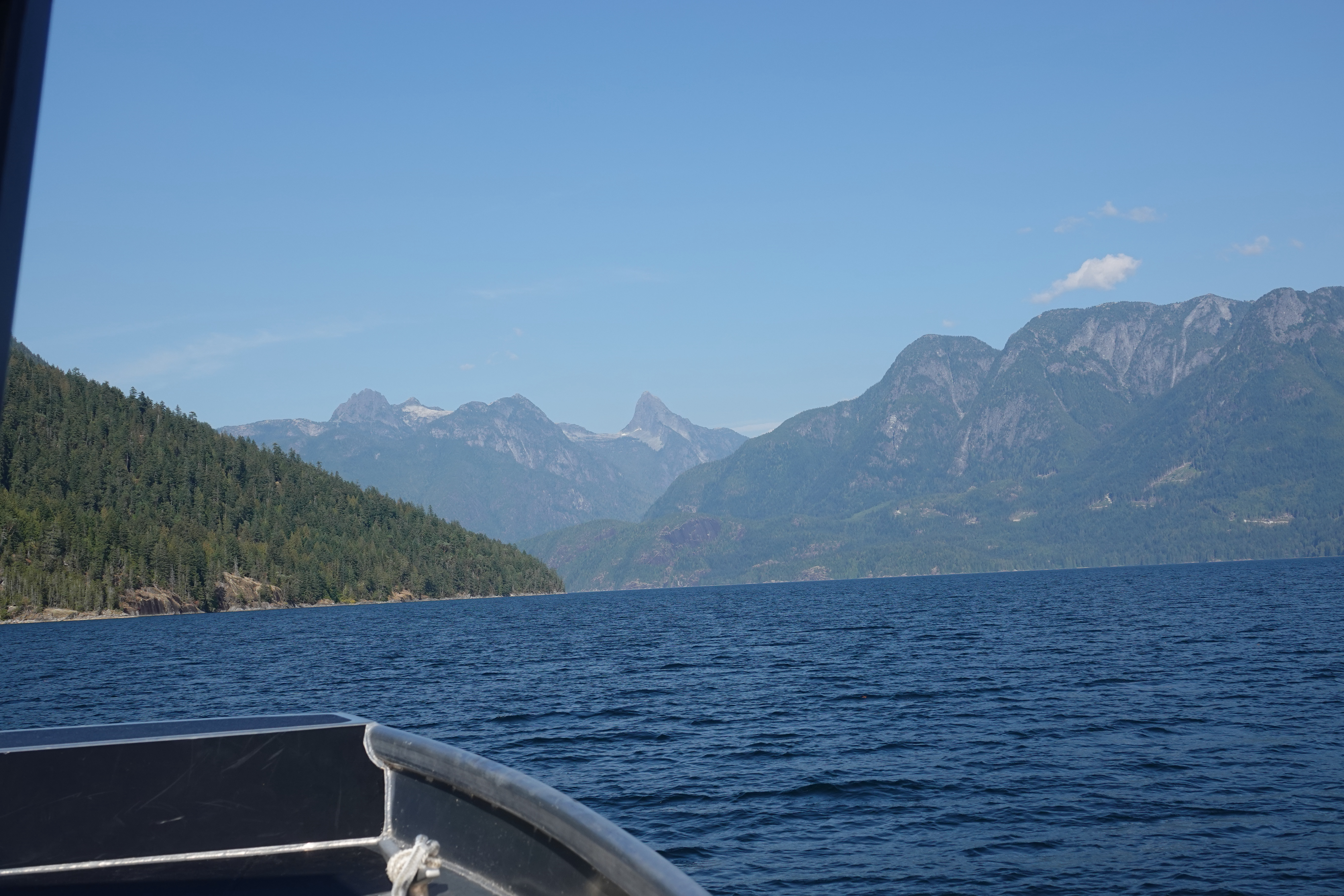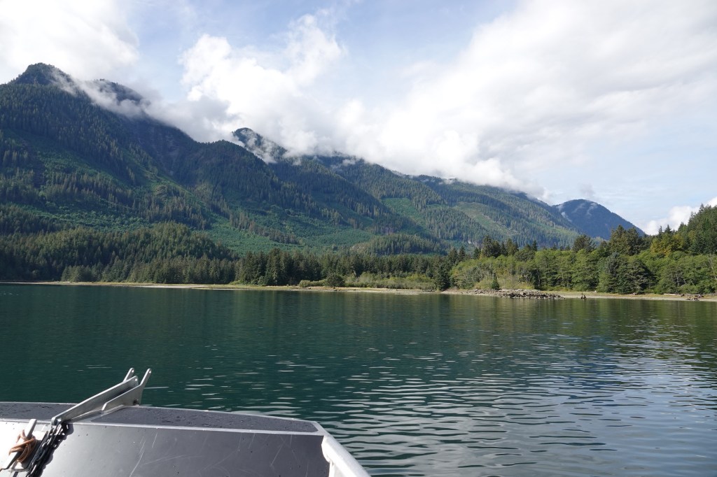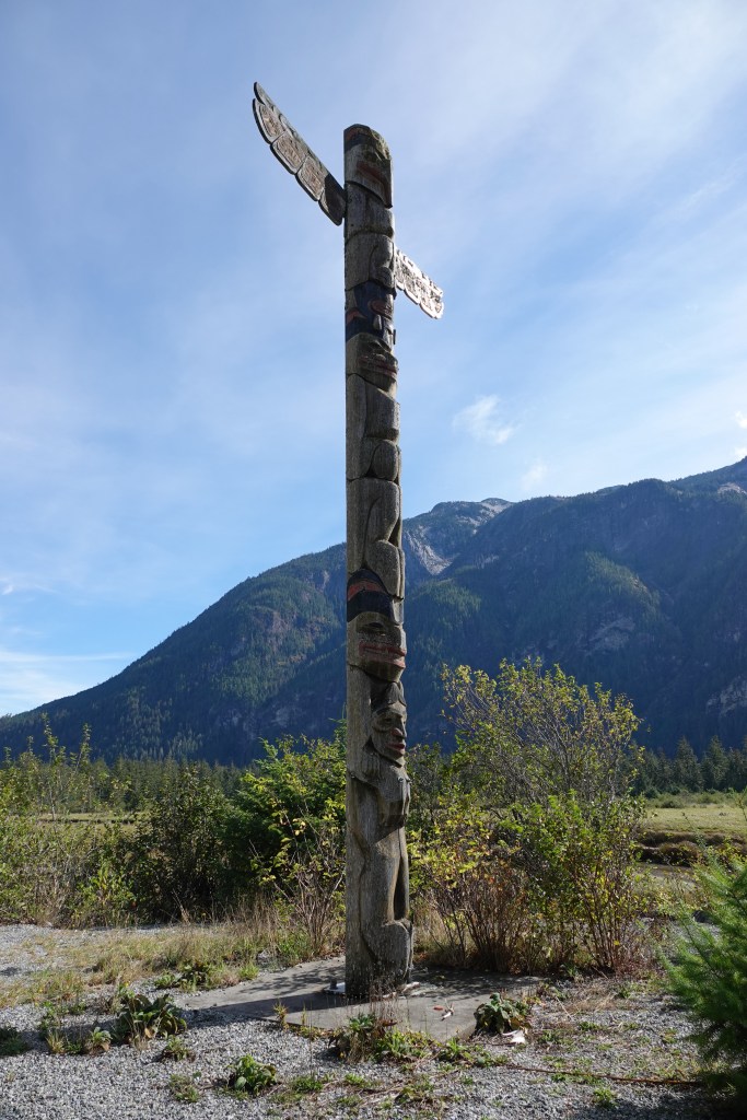 It was time for us to leave the grizzlies and make our way back to the boat. We took in views of the Toba estuary, and were shown a totem pole, carved in Squamish, commemorating eight First Nations workers who died while installing a nearby transmission line.