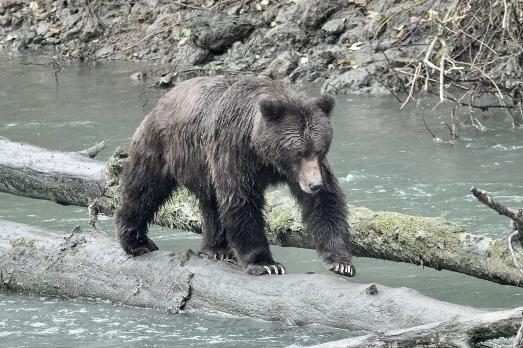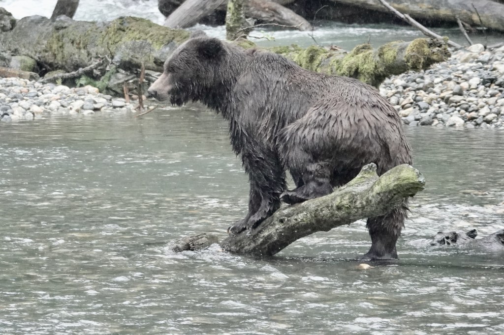 After arriving at the head of the inlet, we disembarked and took a short bus ride over gravel roads to one of a number of purpose-built viewing platforms on the Klite River, a tributary of the main Toba River. The set up for viewing the bears was quite simple. The platforms, set back among the trees, overlooked the river where the bears were feeding on the spawning salmon. We had to be absolutely quiet to not spook the bears, enter the covered viewing platform from the rear, and then wait for the action.