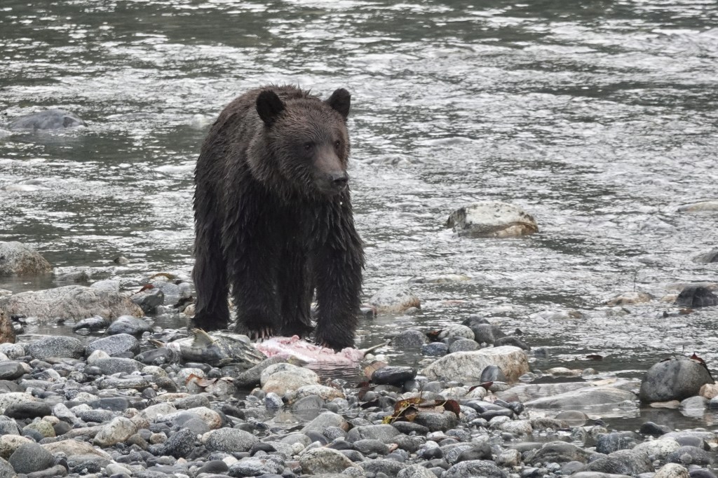The bears would mostly take dead or almost dead fish that had finished spawning. They ate them on the gravel river banks, in shallow water, or almost completely immersed in the deeper waters. At other times, a vigorous pursuit of a surging salmon took place.