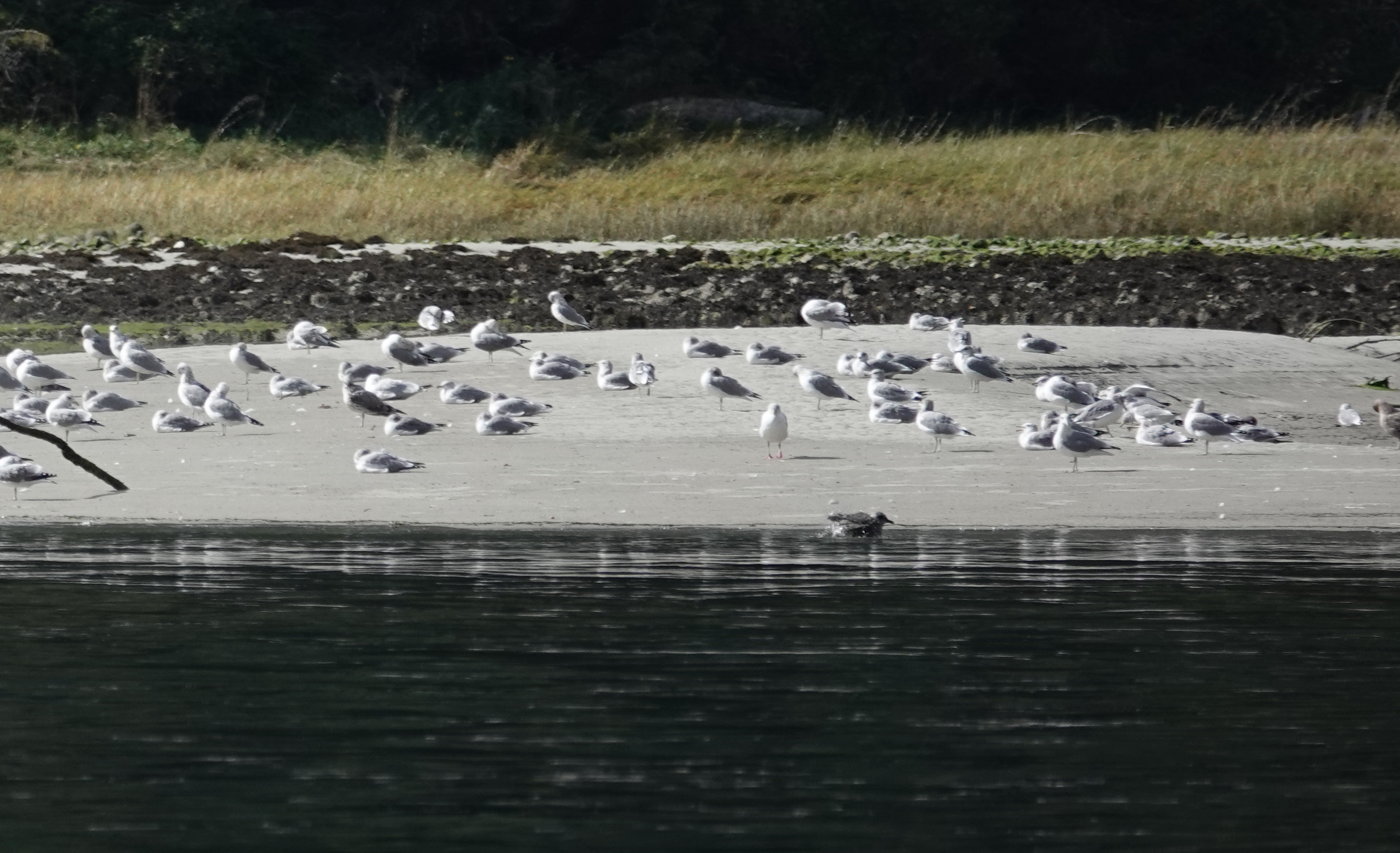The Brem was the birdiest location we stopped at. A large gull roost of mainly California Gulls was on one of the sandbars, and loons, grebes and cormorants were also present. On shore we saw a sow grizzly and two large cubs. Needless to say, we didn’t attempt a landing. This sighting made day 2 an eight grizzly day.