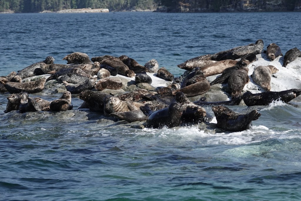 We took a brief pause travelling up the channel to enjoy close views of harbour seals sunning on a rocky shoal. Habituated to regular visits from Goat 1, they were undisturbed by us. However, it would likely have been panic time if a pod of transient orcas, like the ones we saw the day before, had showed up.